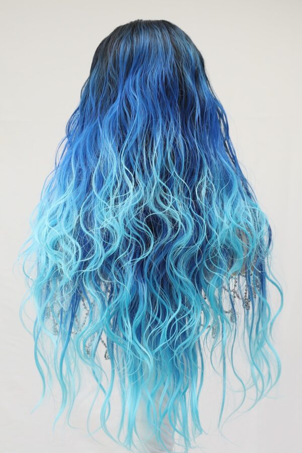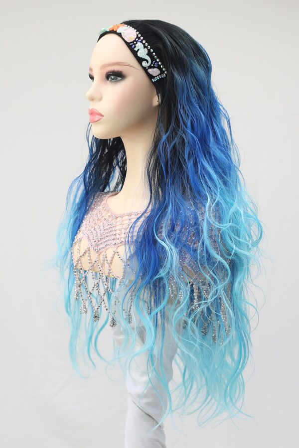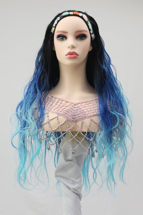 Say hello to Aqua! I am your dip dye/ombre sea blue tone wig with long loose waves. I am decorated with mermaid seashells. The seashells are decorated on my stretch wig headband, and I am very easy to wear. You can have me waterproof lined or simply without, the choice is yours! I will make you look like the queen of the sea!