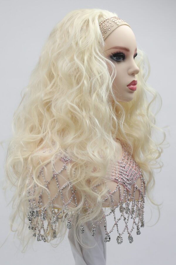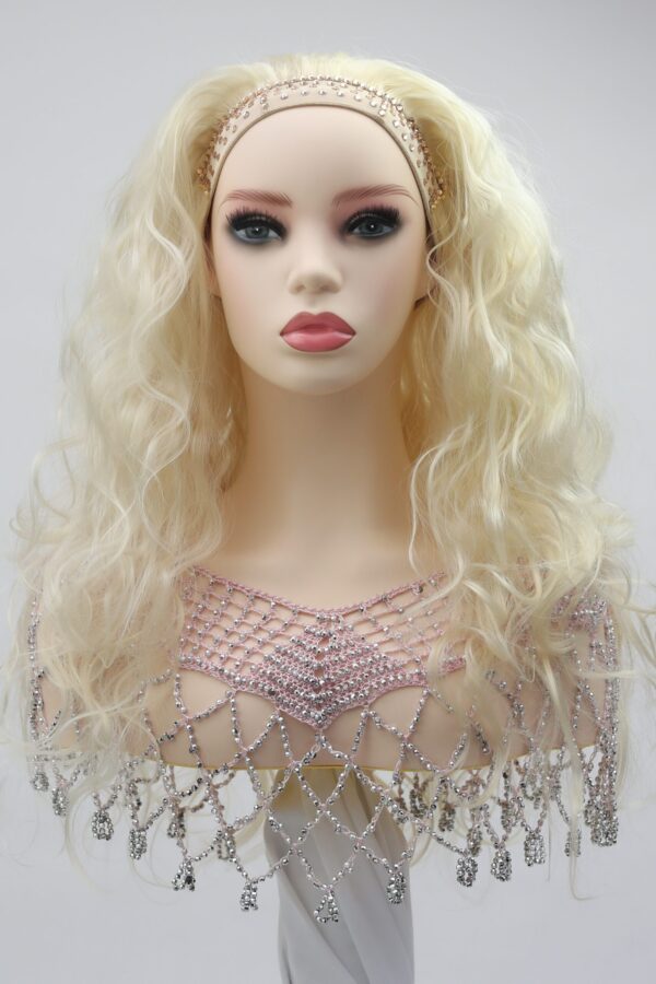 Say hello to Snow! I am your blonde tone wig with long loose waves. I am encrusted with champagne crystal rhinestone diamante 3mm and 5mm size. The stones are encrusted on my stretch wig headband, and I am very easy to wear. You can have me waterproof lined or simply without, the choice is all yours! I will make you look so noticeable; you will melt hearts!