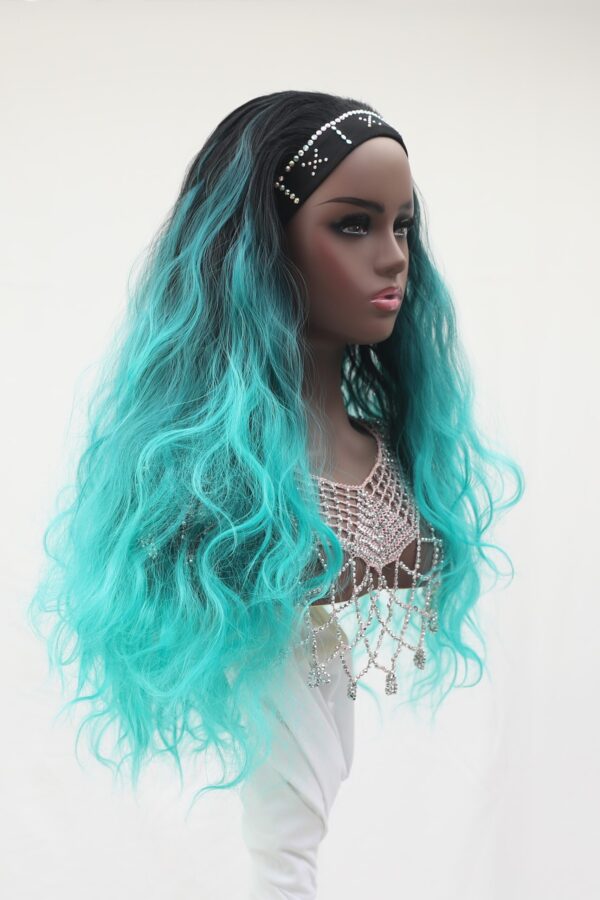 Say hello to Tori! I am your dip dye/ombre turquoise tone wig with long loose waves. I am encrusted with turquoise crystal rhinestone diamante 3mm and 5mm size. The stones are encrusted on my stretch wig headband, and I am very easy to wear. You can have me waterproof lined or simply without, the choice is all yours! I will make you sparkle and give you tranquil energy!